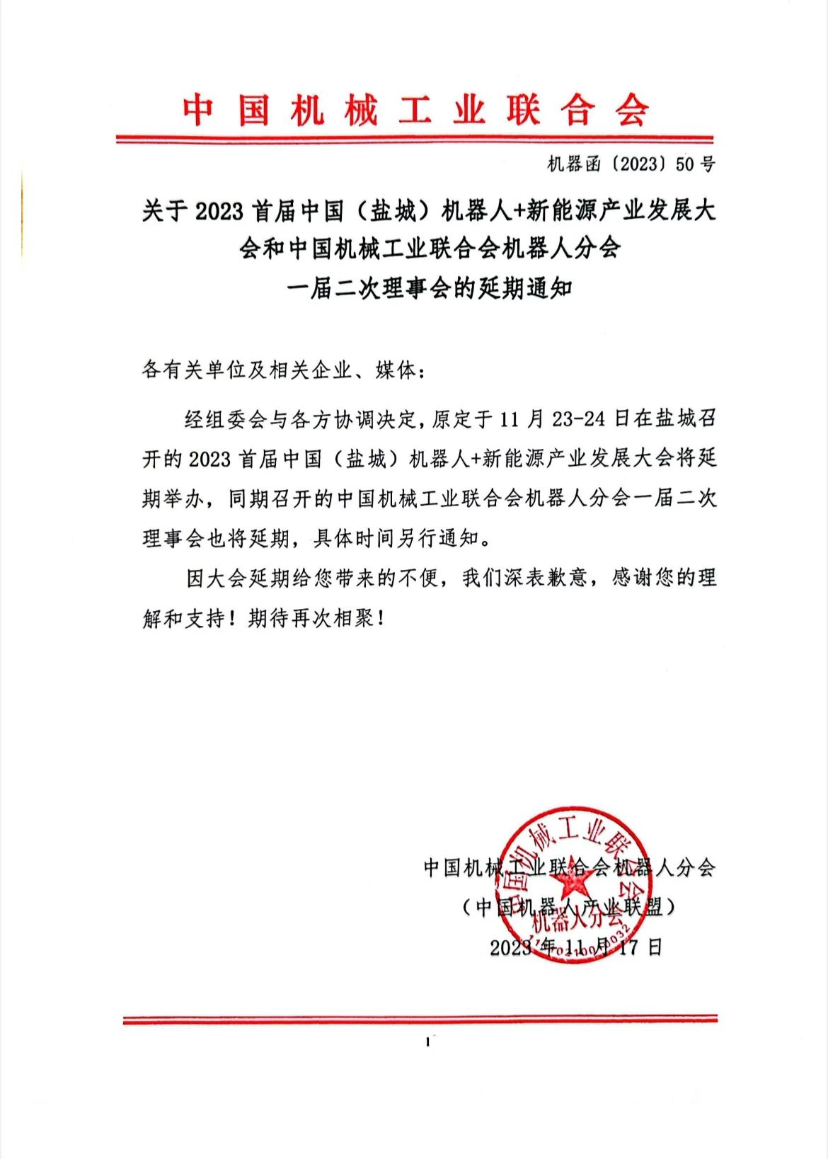 经组委会与各方协调决定,原定于11月23-24日在盐城召开的2023首届中国(盐城)机器人+新能源产业发展大会将延期举办,同期召开的中国机械工业联合会机器人分会一届二次理事会也将延期,具体时间另行通知。