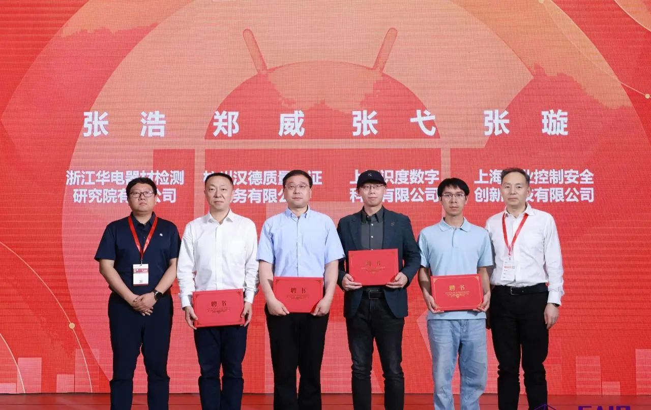 工作组组长郑军奇、副组长刘宇飞为来自浙江华电器材检测JIUYOU.COM九游有限公司、杭州汉德质量认证服务有限公司、上海识度数字科技有限公司、上海工业控制安全创新科技有限公司工作组新进成员颁发专家聘书。
