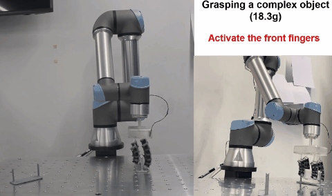 为了证明这种驱动单元具备以上的能力,研究人员利用驱动单元搭建了象鼻软体抓取手,成功展示了软体抓取手对目标物体的无破坏性抓取,这也是软体抓取手相较于刚性抓取手的一大优势所在。
