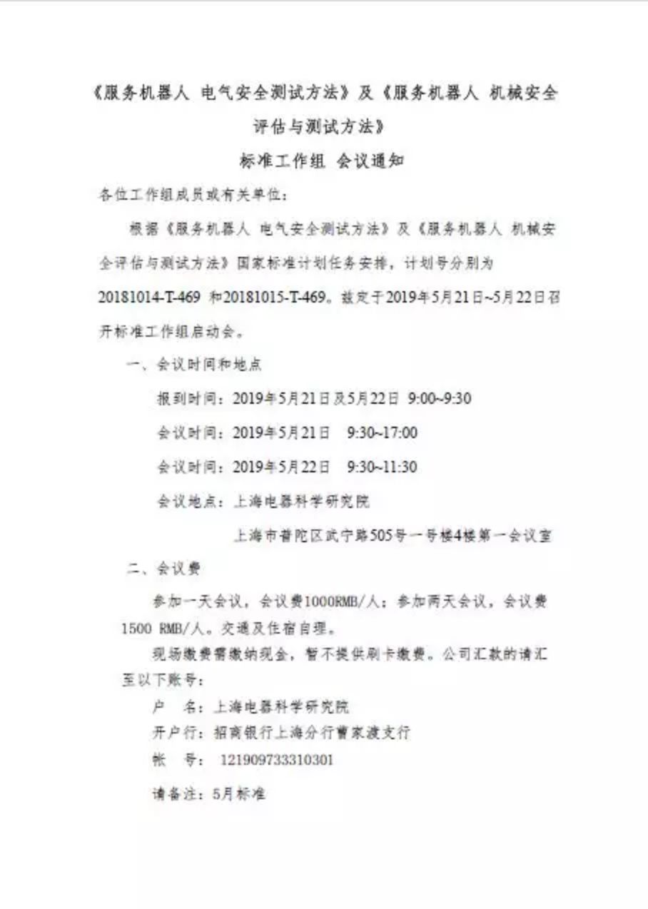 根据《服务机器人 电气安全测试方法》及《服务机器人 机械安全评估与测试方法》国家标准计划任务安排,计划号分别为20181014-T-469 和20181015-T-469。兹定于2019年5月21日~5月22日召开标准工作组启动会。
