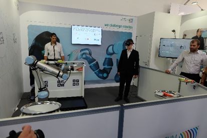 德国宇航中心(Deutsches Zentrum für Luft- und Raumfahrt,简称DLR)展出一款名为HUG(haptic user interface for telemanipulating)的双臂操作系统。 研究人员展示了使用这一系统控制edan进行日常作业。作业内容包括:开冰箱、倒水、玩积木等。这一系统能够很好的解决远程机器人控制问题,例如:太空站中的机器人。