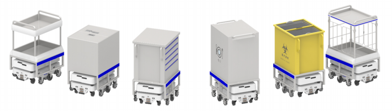 多场景智能搬运机器人采用“积木式”机构设计,可搭配不同货柜、货架,满足不同的运输需求。该系列产品同时具备一键呼叫、自动装卸、即送即走等功能,最高运行速度为1.8m/s。多种机器型号可适配整院6大运输场景(餐饮、 被服、药品垃圾、库房物资、手术室无菌包),并通过统一后台系统实现智能动态调度,实现医院物流效益最大化。
